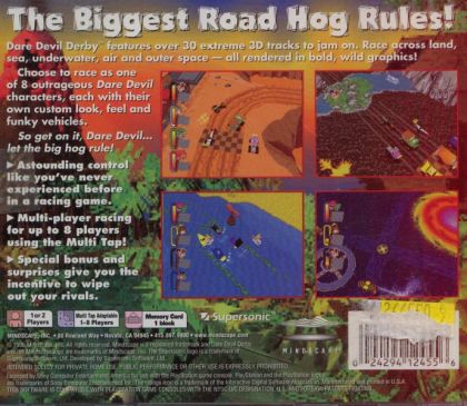 Dare Devil Derby 3D is a cartoonish-type of destruction derby that lets the player take control of 8 unique characters and over 30 different tracks, ranging from jungles, canyons, city streets, underwater, outer space and various other three dimensionally rendered terrain. Power-ups can also be picked up and used to give more power and speed to a players car or even a weapon to knock out rivals.