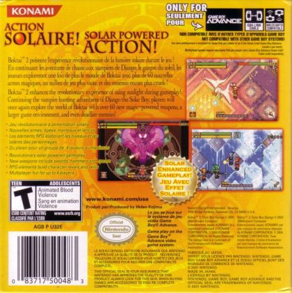 The sequel to Boktai: The Sun is in Your Hand combines, like its predecessor, action gameplay with role-playing and stealth elements. The RPG elements have been expanded in the sequel, allowing more customization of the character. Of course, the sun sensor returns in-built into the cartridge, and you must use the light of the sun to build up the power output of your weapons and defeat the end of level bosses for good. Collect items and trade them with friends or play four player battles.