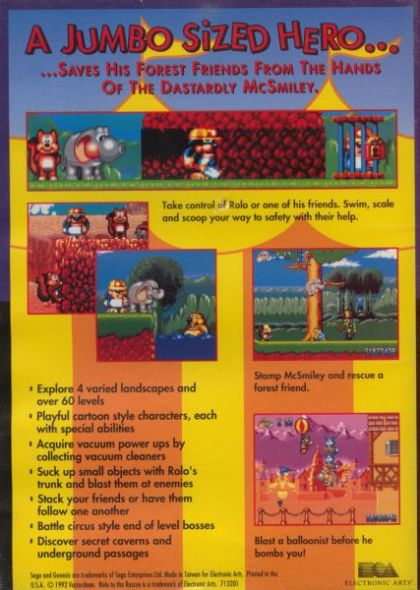 Rolo to the Rescue is a side-scrolling platform action game. The player controls Rolo, an elephant who escaped from the circus. Rolo's main task is to find and rescue four other animals - a squirrel, a rabbit, a beaver, and a mole. Once rescued, each of those friends become player-controlled characters with special abilities that can help the player along the way -- the squirrel can climb, the rabbit jumps, the beaver swims, and the mole digs.