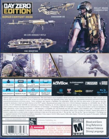 Developed by Sledgehammer Games (co-developers of Call of Duty(r): Modern Warfare(r) 3), harnesses the first three-year, all next-gen development cycle in franchise history. Call of Duty(r): Advanced Warfare envisions the powerful battlegrounds of the future, where both technology and tactic have evolved to usher in a new era of combat for the franchise. Delivering a stunning performance, Academy Award(r) winning actor Kevin Spacey stars as Jonathan Irons - one of the most powerful men in the world - shaping this chilling vision of the future of war.