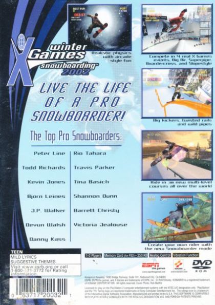 ESPN the Games returns with the second edition of its highly-popular snowboarding franchise, ESPN Winter X Games Snowboarding 2002. Built on the foundation of ESPNs Winter X Games, the cornerstone of pro snowboarding competition, this game allows players to speed through an endless mountain of snowboarding possibilities. By combining the attitude and insight of ESPN with incredibly fluid gameplay, realistic graphics and smooth animations, the game captures all of the pulse-pounding speed and high-flying acrobatics of this popular winter sport. Featuring 4 different events and an innovative Snowboarder "RPG" mode.