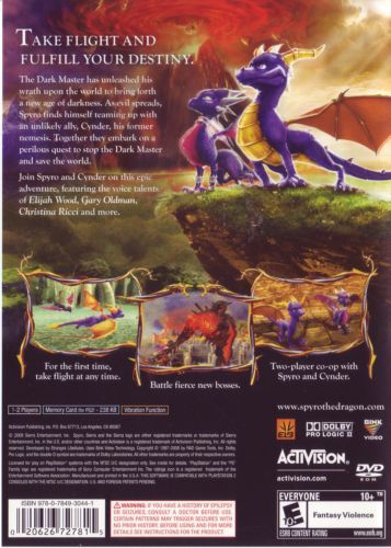 In the culmination of the trilogy, players find Spyro teaming up with an unlikely ally - Cynder, his former enemy, to face his most challenging mission to date. As the Dark Master's (voiced by Mark Hamill) evil envelopes the world like a plague, Spyro must fulfill his destiny and unlock the true power of the purple dragon within him to stop the Dark Master in his tracks.