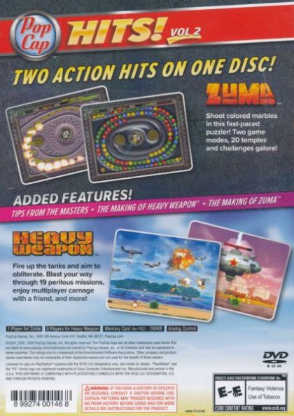 Two Action Hits in one box. ZUMA - Unearth the ancient secrets of Zuma. Survive hidden jungle temples, shoot magical balls to clear a deadly chain, avoid dangerous traps, and do it all before the chain reaches the Golden Skull. Be quick or be history in this action-packed challenge. HEAVY WEAPON - Its shoot-'em -up action at its best. Load your heaviest artillery and blast away tanks and planes on your way to victory against enemy forces. Pull on your boots, arm yourself for action and revel in military pyrotechnics.