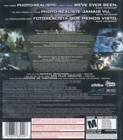 The new action-thriller from the award-winning team at Infinity Ward, the creators of the Call of Duty series, delivers the most intense and cinematic action experience ever. Call of Duty 4: Modern Warfare arms gamers with an arsenal of advanced and powerful modern day firepower and transports them to the most treacherous hotspots around the globe to take on a rogue enemy group threatening the world. As both a U.S Marine and British S.A.S. soldier fighting through an unfolding story full of twists and turns, players use sophisticated technology, superior firepower and coordinated land and air strikes on a battlefield where speed, accuracy and communication are essential to victory. The epic title also delivers an added depth of multiplayer action providing online fans an all-new community of persistence, addictive and customizable gameplay.