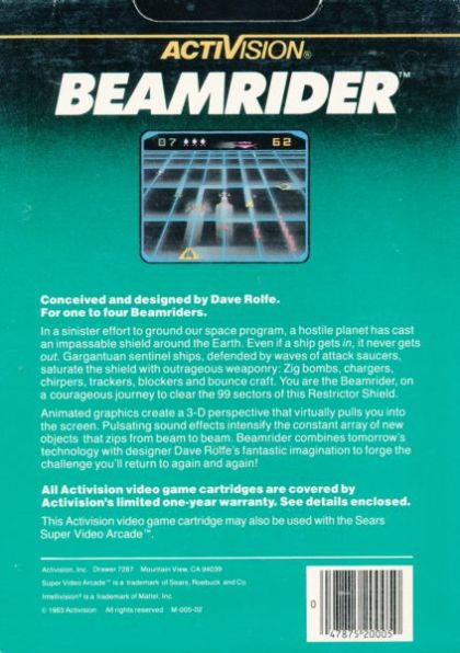 An impenetrable shield of light, 99 sectors deep, is encompassing the planet. You, alone, must cruise from beam to beam, casting lariats of laser bolts into white saucers, red zig bombs, yellow chirpers and more! The quest: to penetrate the shield and restore space exploration to the planet. You have the skill! You have the daring! You are Beamrider!