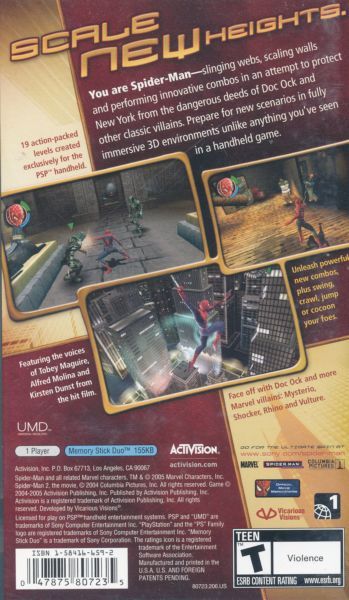 Based on the blockbuster feature film from Columbia Pictures and Marvel, Spider-Man 2 leverages the PSP's processing power to deliver the most realistic Spider-Man experience on a handheld platform. As Spider-Man, players must master new combo moves as they protect the city of Manhattan from the nefarious Doc Ock and other classic Marvel villains by swinging, jumping and wall-crawling through 19 new levels that extend beyond the film. Featuring an unprecedented depth of gameplay, players experience original storylines and battle through graphically rich 3D environments.
