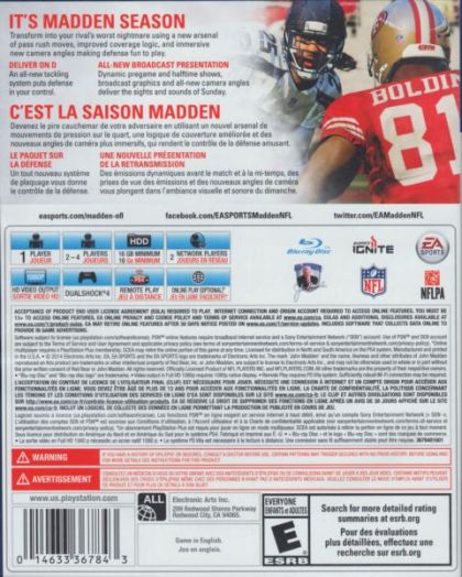Madden NFL 15 is an American football sports video game based on the National Football League and published by EA Sports. The game was announced for the PlayStation 3, PlayStation 4, Xbox 360 and Xbox One on April 28, 2014, and was released on August 26, 2014 in the United States and Europe three days later. As in previous years, EA Sports conducted a fan vote via ESPN to elect the cover athlete for the game.[1] Seattle Seahawks cornerback Richard Sherman won the cover vote.