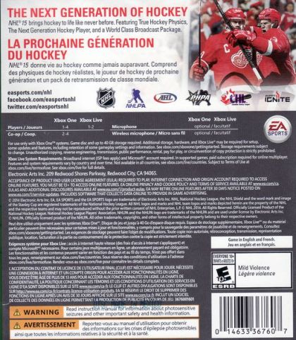 Experience the hard hitting chaos and unpredictability of the sport as real-world physics are extended to all 12 players on the ice, as well as the puck itself. Look, move, play and think like a real hockey player with all new authentic player modelling and an evolved arsenal of tools, including the Superstar Skill Stick and Vision AI that allow for an unprecedented level of control and elevated player intelligence. Take in the emotion of every play as you immerse yourself in authentic arenas across the National Hockey League, in front of a full house of fans created with 9,000 dynamic and individual crowd models, the most ever in a sports videogame. Finally, witness the most realistic broadcast package to date, as NHL 15 overhauls the look of the game with the new NBC SPORTS Game Day Presentation featuring the commentary team of Mike 'Doc' Emrick and Eddie Olczyk, alongside TSN analyst Ray Ferraro.