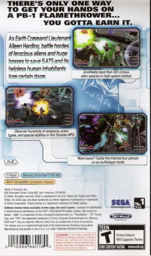 Alien Syndrome features 20 different weapons including flamethrowers, quad-barreled lasers, nanobot swarms that dissolve enemies, and incendiary grenades that shoot fire geysers from the ground. The game's fast-paced combat also allows for any number of combat strategies to defeat over 100 different alien enemies at one time. Alien Syndrome uniquely combines arcade-style shooter gameplay with RPG elements, making it the only fast-paced, sci-fi action-RPG on the PSP.