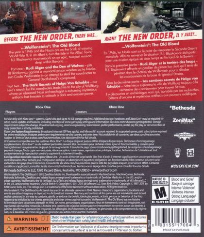 Wolfenstein: The Old Blood is a standalone prequel to the critically acclaimed first-person action-adventure shooter, Wolfenstein: The New Order. The adventure, which spans eight chapters and two interconnected stories, features the hallmarks of MachineGames - thrilling action, immersive story and intense first-person combat. As war hero B.J. Blazkowicz, arm yourself with new weapons such as the bolt-action rifle and grenade-launching Kampfpistole as you attempt to thwart the advancing Nazi war machine, and take advantage of duel-wielding pipes that can be used for wall climbing - or for vicious take-downs of never-before-seen Nazi adversaries.