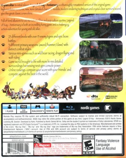10 years after its initial release, Legend of Kay - Anniversary is a thoroughly remastered version of the original game: high-resolution textures; new, more detailed character models; modern rendering techniques and crystal-clear surround sound give this great classic a new shine. Full of fond allusions to old martial arts films and pop culture quotes, Legend of Kay - Anniversary is both an incredibly funny game and a challenging action-adventure for young and old alike.