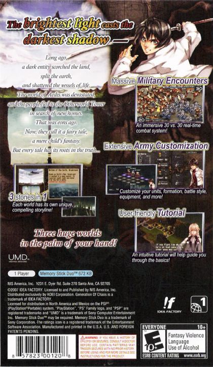 Generation of Chaos: Aedis Eclipse combines team customizing and item crafting with multi-unit battle, for a more in-depth gaming experience. In a world where angels and demons lived together in peace, tragedy strikes. The king of demons is assassinated by a radical group of angels. Now a war has broken out between the 2 factions and you must stop them from destroying the world. On teh surface world, a knight must save his comrades from a ruthless king. Nearby, a school is bombed and a child is pulled into battle. These events come together in this challenging game. The PSP format allows gamers to briefly pick up their hand-held to enjoy strategic thinking anytime, anywhere. Extensive tutorial scenario teach you how to play the game