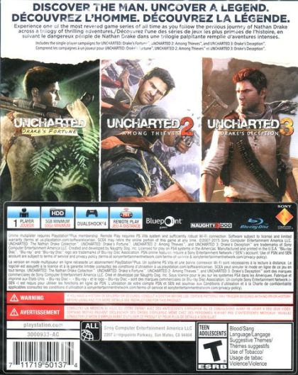 From the groundbreaking storytellers at Naughty Dog, comes the genre-defining epic that revolutionized adventure storytelling, rebuilt by Bluepoint Games with the power of the PS4 system. Experience one of the most revered game series of all time as you follow the perilous journey of Nathan Drake across the globe, from humble beginnings to extraordinary discoveries. Meet an unforgettable cast of characters as Drake puts life and friendship on the line in a race against ruthless enemies to uncover unimaginable treasure. UNCHARTED: The Nathan Drake Collection includes the singleplayer campaigns for UNCHARTED: Drake's Fortune, UNCHARTED 2: Among Thieves, and UNCHARTED 3: Drake's Deception.