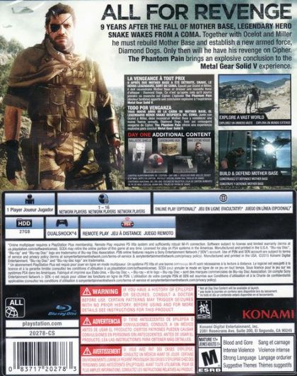 Development powerhouse, Kojima Productions, continues forth the 'METAL GEAR SOLID V Experience' with the latest chapter, METAL GEAR SOLID V: The Phantom Pain. Ushering in a new era for the franchise with cutting-edge technology powered by the Fox Engine, MGSV: The Phantom Pain, will provide players a first-rate gaming experience as they are offered tactical freedom to carry out open-world missions.