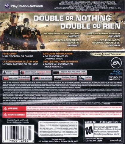 The originator of tactical co-op is back! Developed by Visceral Games, the award-winning creators of Dead Space, Army of TWO The Devil's Cartel delivers an immersive and unique 3rd-person co-op action-shooter that's built on the new Frostbite 2 engine for maximum destruction. You and your partner must shoot and destroy anything in your path to take down a violent drug cartel that's taken over Mexico. In gripping partner-based missions, each player must tackle and overcome individual objectives to achieve a common goal. The more effective your teamwork, the greater the reward as the new Overkill mode gives you devastating power for truly epic mass destruction! Experience this explosive action-blockbuster campaign in two-player local split-screen or online co-op!