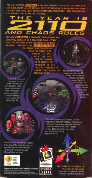In the year 2110, in the city of Meggagrid, once known as Los Angeles, you meet Dr. Grubert, a very prominent inventor who has been crippled by an explosion perpetrated by a crime family known as The Pitt Family. He gives a suit known as the Helipak Flight Suit to fight back and take down the criminals in the city and apprehend The Pitt Family and bring peace back to the city. With an arsenal of nine different weapons and twenty power-ups, the player flies around seven levels of the city with six degrees of freedom.