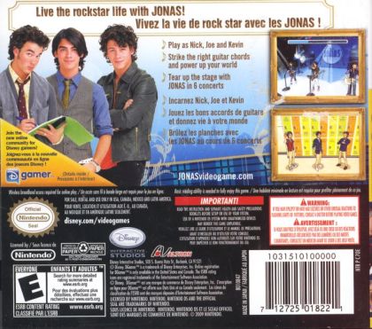Featuring interactive environments, Jonas allows players to collect musical notes to power up their guitars and then strike the right guitar chords to overcome obstacles and help the Jonas band members. The game also features hit songs from the Jonas television show.