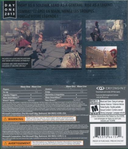 Showcasing the possibilities of Xbox One, "Ryse: Son of Rome" extends the gameplay experience with unique features such as Xbox SmartGlass, Game DVR and the new high-fidelity Kinect, letting you manage your character's progress with your compatible mobile or tablet device, record and share your best gameplay moments with friends, and command legions with the sound of your voice.
