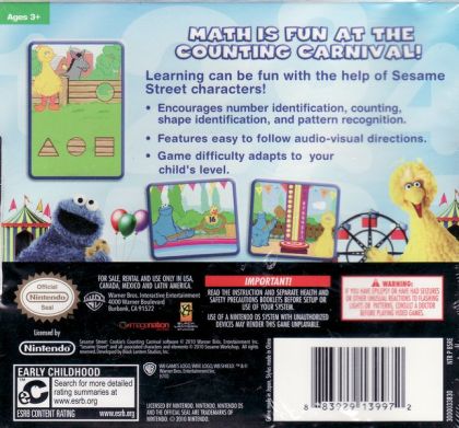 In Sesame Street: Cookie's Counting Carnival, kids join Cookie Monster and Big Bird at a fun-filled carnival, through gameplay steeped in math skills that include number identification, counting, shapes and pattern recognition. Kids journey through the game in the many areas of the carnival such as The Grandstand, Midway, Petting Zoo, Food Court and the Arcade.