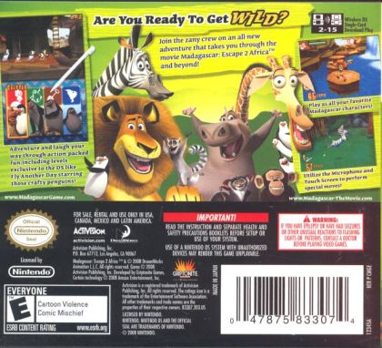 Following the success of the 2005 blockbuster hit and #1 kid's movie game Madagascar comes an all-new wacky adventure in the Madagascar: Escape 2 Africa Video Game. Based on the upcoming feature film from DreamWorks Animation, the four famous zoo animals ... Alex the Lion, Marty the Zebra, Melman the Giraffe and Gloria the Hippo ... and their entire madcap Madagascar crew take players on a whole new action-packed journey to help save the African savannah. Assuming the roles of all their favorite characters, including those crafty penguins, players must work through 12 distinct levels featuring a variety of wild adventures and fun mini-games. In addition to the diverse single-player gameplay, the Madagascar: Escape 2 Africa Video Game delivers an enhanced multiplayer tournament mode allowing gamers to participate in outlandish competitions alongside or against friends and family.