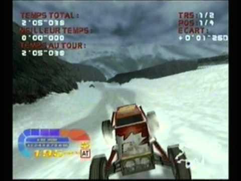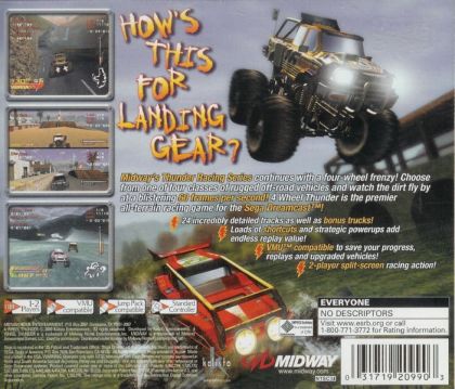 4 Wheel Thunder is the off-road racing sequel to the popular power-boat racing game, Hydro Thunder. In this game, players race around two types of courses; huge outdoor tracks and smaller indoor tracks. All in all, there are 24 areas in which to race, including various day/night, rain/sunshine variations. The game includes the standard championship, practice race, and 2-player modes.