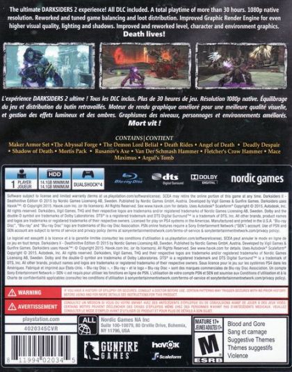 Like the original Darksiders game before it, the second iteration of the series is primarily a hack 'n slash adventure. The game takes place across netherworld environments, including "The White city," an outpost where angels live, and "The Eternal Throne," a floating fortress where the Lords of the Dead stand guard over souls that need to be cleansed. Although Death is the most feared of the Four Horsemen, his physical abilities are very different than his brother, War. Death is far more nimble, and relies on a combination of melee and ranged attacks. In combat Death's primary weapon is his huge iconic scythe, with a wide range of other weapons and usable items that must be gathered as the game progresses. Weapons can be dual-wielded, upgradable armor can be acquired for protection and Death has access to his terrifying and powerful mount, Despair.