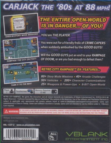 A parody of the open-world action genre, Retro City Rampage takes modern game mechanics and mashes them into an authentic 8-bit experience. It's one half fast paced arcade game, the other half a hilarious story mode! It's all the driving and shooting you'd expect and a whole lot more! With missions that twist pages straight from classic game experiences, you get to re-live and rewrite history in a way only a modern anti-hero could! When it comes to enemies, weapons are only the beginning! Put on your boots and jump on their heads! Toss 'em around to knock the rest down! Become truly unstoppable with awesome power-ups! Through its world, characters and missions, Retro City Rampage lampoons the entire 8-bit era from its games to the TV, movies and pop culture!