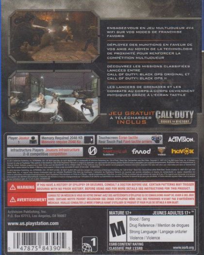 Call of Duty: Black Ops Declassified brings the classic Call of Duty-style gameplay to gamers on-the-go in the most intense handheld Call of Duty experience only on PlayStation Vita. The title features intense 4v4 multiplayer action across popular modes along with the hallmark Call of Duty gameplay, including Care Packages, Create-a-Class, Killstreaks, Perks, and even Prestiging. Delivering an original fiction set within the Call of Duty: Black Ops universe, Declassified offers a complementary series of single player operations. With touchscreen and "Near" features, Call of Duty: Black Ops Declassified puts the adrenaline-rush action of Call of Duty in the palm of your hands.