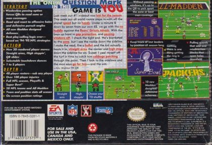 ACTION! Ultra-competitive computer opponent. New 3-D rendered player moves; straight arms, high steppin', QB slides. Bigger field DEPTH! Complete 1994 NFLPA rosters. 48 player rosters - sub any player in any formation. Over 100 player injuries. Full NFL season, Playoffs and Super Bowl. 28 NFL and All Madden teams. STRATEGY! Windowless passing option forces QBs to read zone or man coverages. All-new Madden-designed defenses. Best play calling logic ever - based on '94-'95 NFL strategies!
