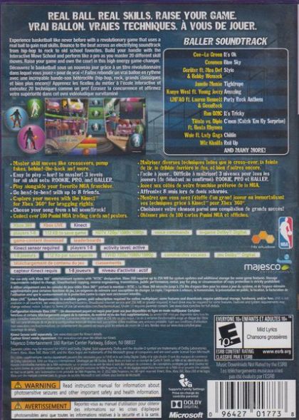 Aspire to perform like a pro in NBA Baller Beats as you train alongside your favorite NBA franchise unlocking songs, difficulty levels, and over 100 posters and trading cards showcasing NBA players' greatest moves. The music is your guide as you master ball handling skills, dribbling, and baller moves with a real basketball as Kinect technology tracks your every crossover, pump fake, behind-the-back, around-the-world and more! Become the ultimate baller and increase your stamina in single player mode, break it down and practice different skills in Move School mode or show-off in multiplayer mode and go head-to-head against up to 8 players - the highest score wins bragging rights. No matter the level of your skills, players of all abilities will enjoy getting off the couch and raising their game with NBA Baller Beats.