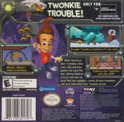 Jimmy Neutron sets off on another adventure filled with brand-new inventions and gadgets. Aliens from Twonkus-3--the annual comet that passes over Retroville--have overrun the town, threatening everything in their path. When the aliens hear music, they become agitated and grow even larger. As Jimmy, it's up to you to figure out combinations of everyday items and turn them into inventions that will defeat the Twonkus-3 aliens. Secret gizmos hidden throughout each level give you enhanced power-ups.
