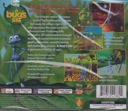 Based on the animated film, A Bug's Life is an epic game of miniature proportions. The story follows the exciting adventures of a misfit ant named Flik as he tries to save his colony from a greedy gang of grasshoppers led by Hopper. As Flik, you travel through fully interactive 3D environments brought to life with cinematic quality animation, smooth controls, and challenging puzzles. Get ready for a bug's-eye-view in an incredible and fast-paced adventure.