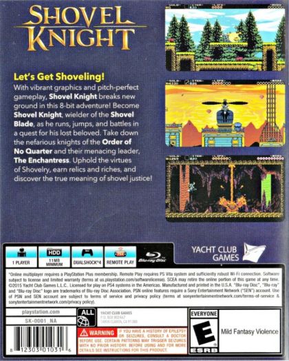 Shovel Knight is a sweeping classic action adventure game with awesome gameplay, memorable characters, and an 8-bit retro aesthetic. It's a hot mashup of new and old! You play as the eponymous Shovel Knight, a small knight with a huge quest. Shovel Knight has come to this land with two goals: to defeat the evil Enchantress and quest for his lost beloved. He wields a Shovel Blade: a multipurpose weapon whose techniques have now been lost to the ages. Always honest and helpful, Shovel Knight is a shining example of the code of Shovelry: Slash Mercilessly and Dig Tirelessly!