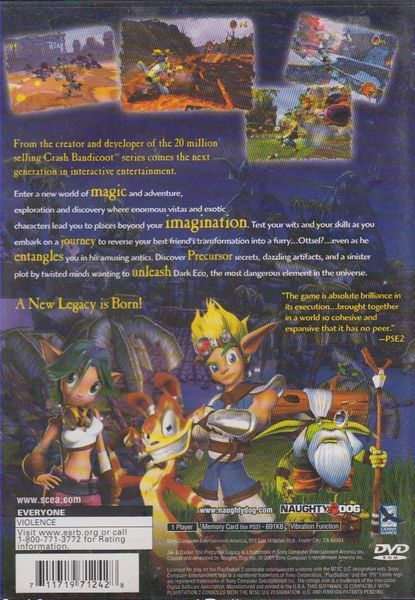 While exploring some ancient ruins on a forbidden island off the coast, your best friend Daxter, is knocked into a vat of Dark Eco— a terrifying and deadly substance that could corrupt the world forever— transforming him into a weasel-like rodent. You seek the advice of the village sage, Samos Hagai, who tells you that there may only be one person who holds the secrets to transforming Daxter back. Now, Jak and Daxter must set out on a quest in search of a wise old sage who has the power to restore Daxter to his former self. Plunge intoa a world of new adventrue, exploration and discovery. Embark on a magical yet sometimes harrowing journey that challenges gamers to test their wits and skills and allows them to discover twisted plots and battle the evil within.