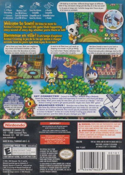 Dubbed as a "communication game" by Nintendo, Animal Crossing creates a virtual community of which the player is but a single member. Players begin by naming their character and town, and then setting the date before moving into their new Animal Crossing settlement. The town's denizens are talking animals, and the emphasis is placed on making friends and creating a virtual life. By using the GameCube's real-time clock, the game reflects actual time of day or night. Play at six in the morning, for example, and many characters will still be asleep, while others will be getting a jump-start on their day. Holidays are celebrated and the world changes accordingly, with lights hanging on trees at Christmas, for instance. Certain in-game events will only occur at specific times during the day, and some characters will only appear at set intervals. As with everyday life, characters need to get a job in order to make the money needed to purchase new items for their house as well as pay off loans. Using the Nintendo GameCube -- Game Boy Advance Cable, players will be able to design new textures and outfits on the handheld and transfer them back to the GameCube so they appear in the game. Animal Crossing can also be played by up to four players, though not simultaneously. Others can visit and leave notes and items for the primary player. The game also provides a host of events and things to do to keep players occupied. Catching bugs and fish could yield some extra cash, but time might be better spent on planting fruit trees or perhaps forging new relationships with some of the neighbors. Faithful reproductions of NES games can also be collected, played, and transferred to the Game Boy Advance, including Donkey Kong, Ice Climber, Baseball, Punch-Out!!, Pinball, and Excitebike.