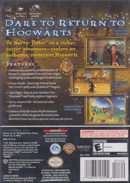 Making its GameCube debut, Harry Potter and the Chamber of Secrets continues the adventures of the bespectacled boy wizard as he returns to Hogwarts to begin a second year of studies. Things do not go smoothly, however, as the game closely follows the events found within J.K. Rowling's second book in the international best-selling fantasy series. Harry Potter and friends Hermione and Ron must investigate a terrible danger: students are mysteriously turning to stone. Assuming the role of the Boy Who Lived, players explore Hogwarts, Diagon Alley, and the Forbidden Forest from a third-person perspective. To help them in their quest, players can attend classes to learn a variety of spells. These spells are then used on enemies, but if they are not cast correctly, a comical or hazardous misfire may result. As players try to solve the mystery of the petrified pupils, they will fly around Hogwarts on the Nimbus 2000, participate in a 3D game of Quidditch, and converse with fantastical creatures such as Moaning Myrtle. In addition to the main adventure, players can participate in a number of mini-games, such as removing the gnomes from Mrs. Weasley's garden, collecting Wizard Cards, or battling others in Dueling Club. Game Boy Advance owners can also link the handheld to the GameCube to access extra features. A Harry Potter sliding puzzle game is available for their handheld as well as an exclusive GameCube level in Gringotts Bank. While the Game Boy Advance version of Harry Potter: Chamber of Secrets is required in order to unlock Gringotts, players will also be able to unlock an additional level for the handheld game: the Forbidden Forest.