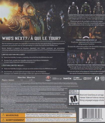 Mortal Kombat X is NetherRealm Studios' next highly anticipated installment in its legendary, critically acclaimed fighting game franchise that propels the iconic franchise into a new generation. The game combines cinematic presentation with all new gameplay to deliver the most brutal Kombat experience ever, offering a new fully-connected experience that launches players into a persistent online contest where every fight matters in a global battle for supremacy. For the first time, Mortal Kombat X gives players the ability to choose from multiple variations of each character impacting both strategy and fighting style. Players step into an original story showcasing some of the game's most prolific characters including Scorpion and Sub-Zero, while introducing new challengers that represent the forces of good and evil and tie the tale together.