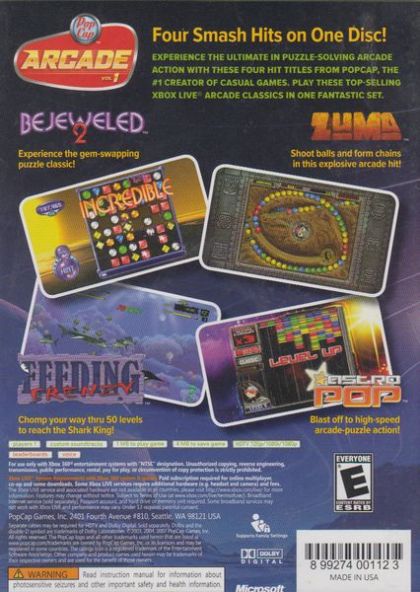 PopCap brings its greatest hits from computers, mobile phones and the Xbox Live Arcade right into the Xbox 360 console. This compilation features perennial favorites AstroPop, Zuma, Feeding Frenzy and the most popular Popcap game to date, Bejeweled 2.