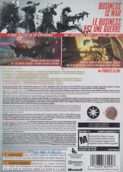 In the not too distant future, the world is divided into regions controlled by mega-corporations known as Syndicates. In this future, business is war, and you are the weapon: the latest prototype agent for Eurocorp, one of the most ruthless Syndicates in a world dominated by greed. In single-player, embark on a unique sci-fi shooter adventure of corruption and revenge, as you utilize DART 6 chip-enhanced technology to breech, manipulate and control the wired world. Or form your own Syndicate in four-player co-op and dominate nine action-packed missions inspired by the original Syndicate game.