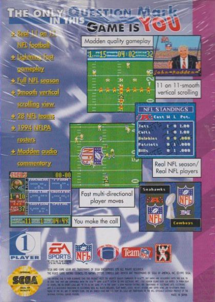 ACTION! Ultra-competitive computer opponent. New 3-D rendered player moves; straight arms, high steppin', QB slides. Bigger field DEPTH! Complete 1994 NFLPA rosters. 48 player rosters - sub any player in any formation. Over 100 player injuries. Full NFL season, Playoffs and Super Bowl. 28 NFL and All Madden teams. STRATEGY! Windowless passing option forces QBs to read zone or man coverages. All-new Madden-designed defenses. Best play calling logic ever - based on '94-'95 NFL strategies!
