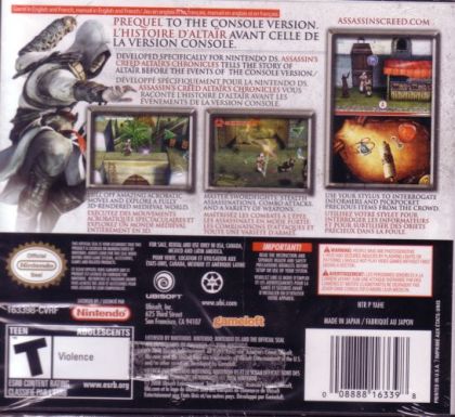 The setting is 1191 AD. The Third Crusade is tearing the Holy Land apart. You, Altair, intend to stop the hostilities by suppressing both sides of the conflict. You are an Assassin, a warrior shrouded in secrecy and feared for your ruthlessness. Your actions can throw your immediate environment into chaos, and your existence will shape events during this pivotal moment in history. Be an Assassin Master the skills, tactics, and weapons of history's deadliest and most secretive clan of warriors. Plan your attacks, strike without mercy, and fight your way to escape. Realistic and responsive environments-Crowds react to your moves and will either help or hinder you on your quests. Action with a new dimension -- total freedom Eliminate your targets wherever, whenever, and however. Stalk your prey through richly detailed, historically accurate, open-ended environments. Scale buildings, mount horses, blend in with crowds. Do whatever it takes to achieve your objectives. Pull off amazing acrobatic moves and explore a fully 3D-rendered medieval world Master swordfights, stealth assassinations, combo attacks, and a variety of weapons Use your stylus to interrogate informers and pickpocket precious items from the crowd ESRB Rated T for Teen