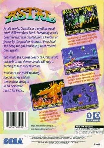 Astal is a side-scrolling platform game with lots of Anime-esque background detail. You have birds helping you if you can rescue them. Special moves such as a smart bomb can be collected.