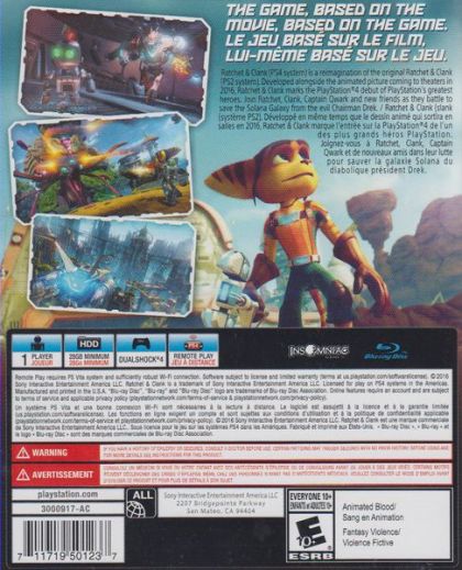 Ratchet & Clank (PS4) is a new game based on elements from the original Ratchet & Clank (PS2), featuring more than an hour of new cinematics (including footage from the film) in vibrant 1080p, new locations, weapons, bosses and more. Join Ratchet, Clank, Captain Qwark and new friends as they embark on an intergalactic adventure, and experience the start of an epic friendship (again) on PlayStation 4.