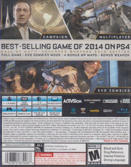 Developed by Sledgehammer Games (co-developers of Call of Duty®: Modern Warfare® 3), harnesses the first three-year, all next-gen development cycle in franchise history. Call of Duty®: Advanced Warfare envisions the powerful battlegrounds of the future, where both technology and tactic have evolved to usher in a new era of combat for the franchise. Delivering a stunning performance, Academy Award® winning actor Kevin Spacey stars as Jonathan Irons - one of the most powerful men in the world - shaping this chilling vision of the future of war.