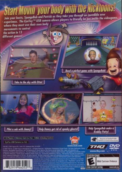 Nicktoons Movin' is an EyeToy mini-game collection based on popular Nickelodeon cartoons. The game features 13 different mini-games with different skill levels based on series like SpongeBob SquarePants, Jimmy Neutron, The Fairly OddParents and Danny Phantom. The players steer a hang glider, control a bowling ball, defend a goal against pucks playing as a goalie, guide a submarine, zap ghosts, solve a classic puzzle by moving the pieces, and more - all by EyeToy registered movement of the player's hands.