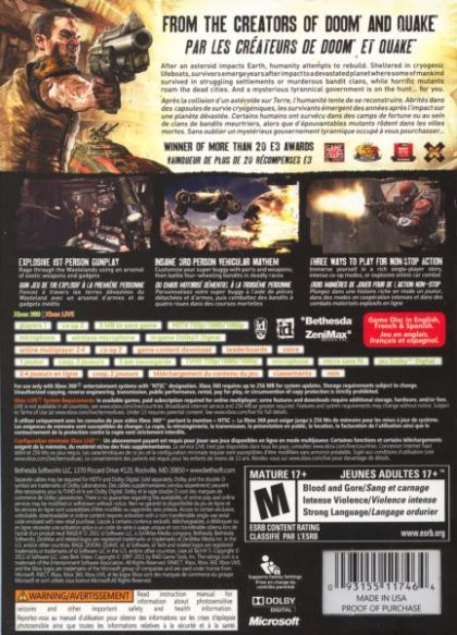 RAGE is a groundbreaking first-person shooter set in the not-too-distant future after the asteroid Apophis impacts Earth. In an effort to save civilization, "Arks" are constructed and buried deep underground. These cryogenic lifeboats carry humanity's future, preserved with the tools they need to rebuild. But when survivors begin to emerge, they find the unexpected. Many humans who were above ground during the impact unexpectedly survived, while horrific mutants roam the dead cities. And a mysterious tyrannical government, bent on creating a new world order, has begun the search... for you.