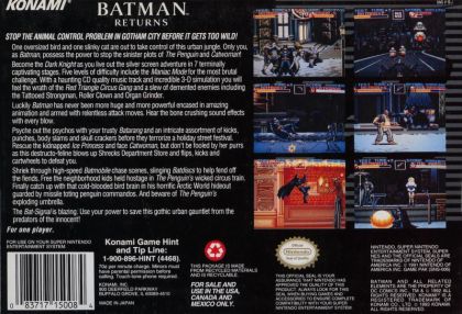 The successful movie sequel Batman Returns spawned many different game adaptations. The SNES version presents the story of Batman's encounter with the Penguin and Catwoman as a side-scrolling beat'em'up, with one Batmobile driving sequence thrown in.