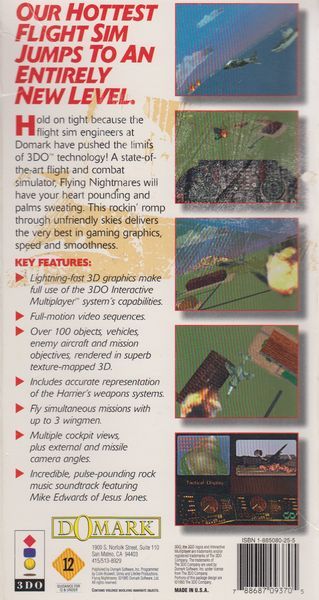 Hold on tight because the flight sim engineers at Domark have pushed the limits of 3DO technology! A state-of-the-art flight and combat simulator, Flying Nightmares will have your heart pounding and palms sweating. This rockin' romp through unfriendly skies delivers the very best in gaming graphics, speed and smoothness. Lightning-fast 3D graphics make full use of the 3DO Interactive Multiplayer system's capabilities. Over 100 objects, vehicles, enemy aircraft and mission objectives, rendered in superb texture-mapped 3D.
