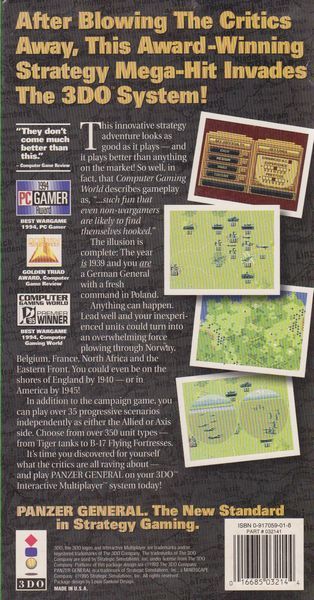 The year is 1939 and you are a German General with a fresh command in Poland. Anything can happen. Lead well and your inexperienced unit could turn into an overwhelming force plowing through Norway, Belgium, France, North Africa and the Eastern Front. You could even be on the shores of England by 1940 - or in America by 1945. In addition to the campaign game, you can play over 35 progressive scenarios independently as either the Allied or Axis side. Choose from over 350 unit types - from Tiger tanks to B-17 Flying Fortresses. It's time you discovered for yourself what the critics are all raving about - and play PANZER GENERAL on your 3DO Interactive Multiplayer system today!