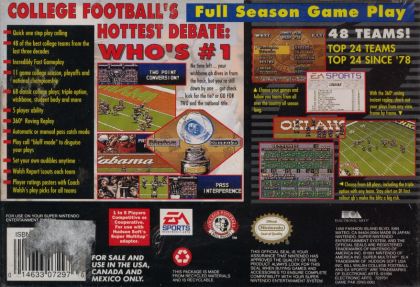 The game features 24 college football teams from the 1993 season and 24 of the all-time college teams since 1978. Play modes include exhibition, playoffs and all-time playoffs and the SNES version also has an eleven week season mode.with the National Championship as the ultimate goal.